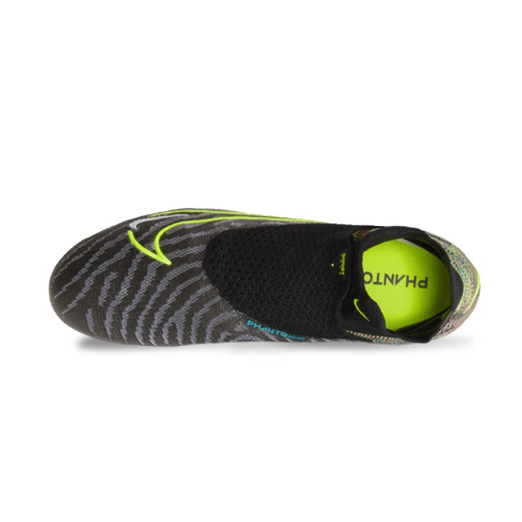 Bota de fĂștbol Nike Phantom GX Elite DF FG para adultos. Bota de hilo con calcetĂn, para utilizar en campos de hierba natural seca o hĂșmeda. Botas de gama alta para jugadores de control y precisiĂłn en color  Black-Volt-White-Blue Glow-Pink Blast