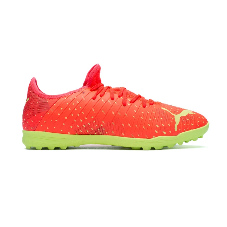 Bota de fĂștbol Puma Future 4.4 Turf para adultos. Botas sintĂ©ticas para utilizar en campos de hierba artificial y moqueta. Botas de gama baja en color Fiery Coral-Fizzy Light-Puma Black-Salmon.