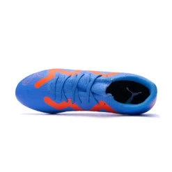 Bota de fĂștbol Puma Future Play FG/AG para adultos. Botas sintĂ©ticas para utilizar en campos de hierba artificial y hierba natural. Botas de gama baja en color Blue Glimmer-White-Ultra Orange